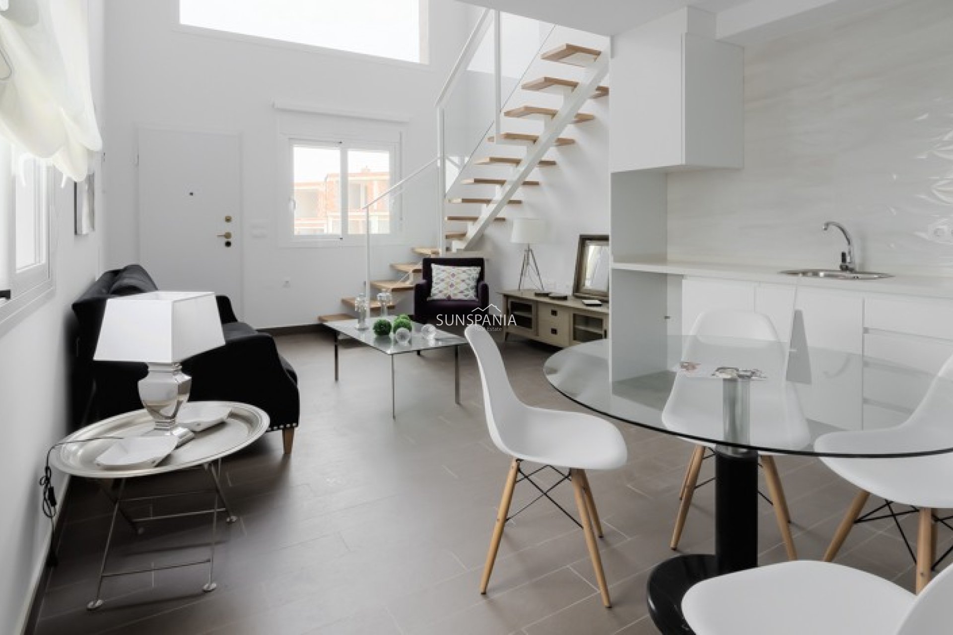 Belle maison de ville à Gran Alacant avec 3 étages, elle a 140m2 construits, 120m2 de surface habitable sur 75m2 de terrain avec 25m2 de parking-jardin, au rez-de-chaussée vous avez un salon-salle à manger, une cuisine ouverte, une salle de bains et une chambre, au dernier étage une salle de bain et deux chambres, vous disposez également d'un sous-sol de 30m2. Cette propriété est située dans un complexe avec piscine commune et espace vert.